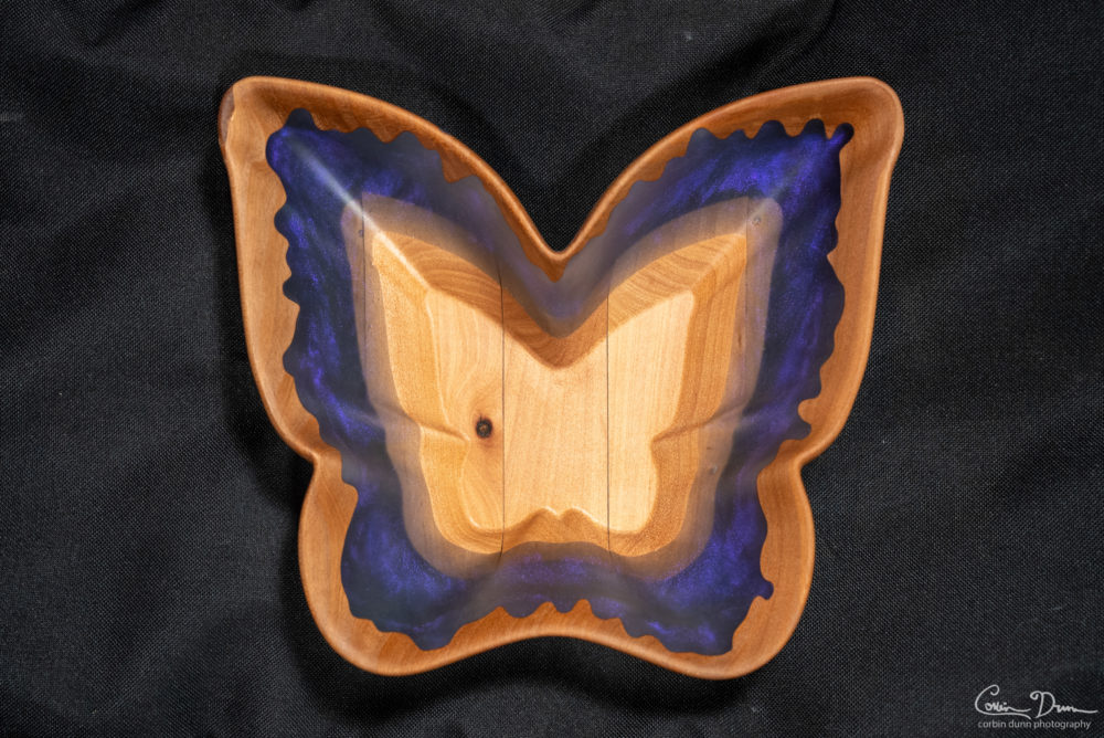 This was the last butterfly bowl that I made in my old workshop. It’s madrone wood with epoxy in the middle. I wanted to create an “inverse drip” where the wood drips down from the top of the bowl. I thought it would also look nice with a solid piece on the bottom. This creates another strong butterfly outline. The bottom pieces are individual pieces that floated in the epoxy, so there is a slight gap between them.
