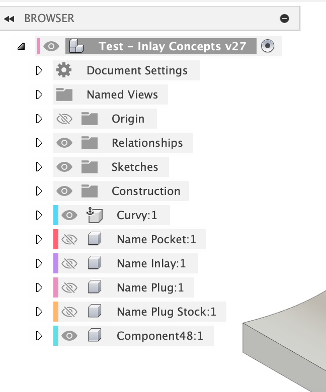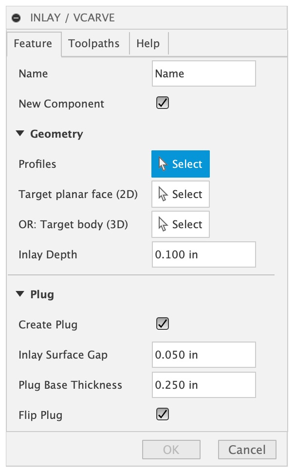 When to NOT use “New Component”: In general, if you want to have a bunch of inlays targeting one particular body, I recommend unchecking “New Component”. This is generally only useful for flat 2D inlays. For 3D shaped inlays, you will likely need to machine your basic shape before actually machining the inlay pocket, so you need a copy of the basic shape without the inlay pocket to get it done correctly.