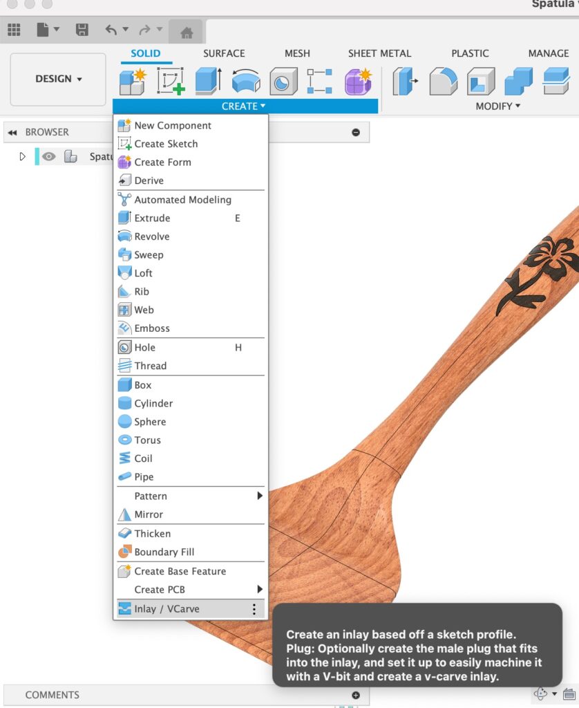 In the Design Workspace, in the Solid environment, click Create -> Inlay / VCarve to bring up the primary command.