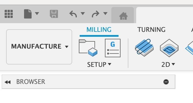 Sometimes the CAM workspace browser shows up empty, as shown to the right. Clicking the Show/Hide icon doesn’t help. You have to close the project and reopen it to get it to show up.