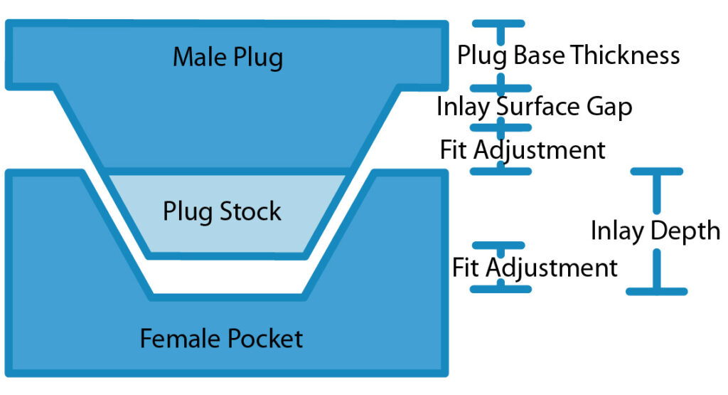 Male Plug: The complete male plug that will fit into the inlay when you are constructing it. This includes a backing, the Base Plug Thickness. It is the gray part in the image.
