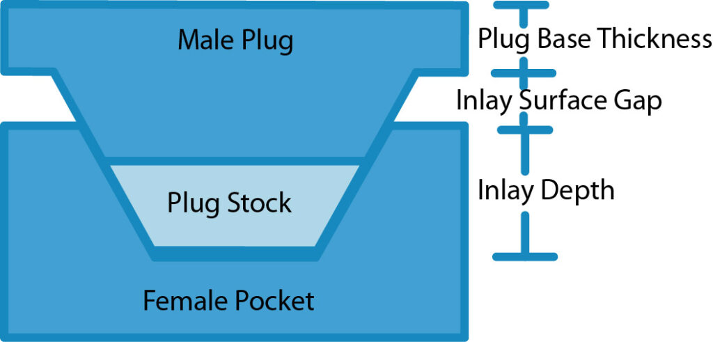 The Inlay Depth is how deep the inlay will go into the Female Pocket. The Male Plug will have a Plug Base Thickness to hold it all together, which you will remove after the inlay glue has dried. The Inlay Surface Gap is the space between the base and the top of the inlay. The Plug Stock is additional material not in the design, but in the stock that allows the inlay to seat correctly (this will be explained more later).
