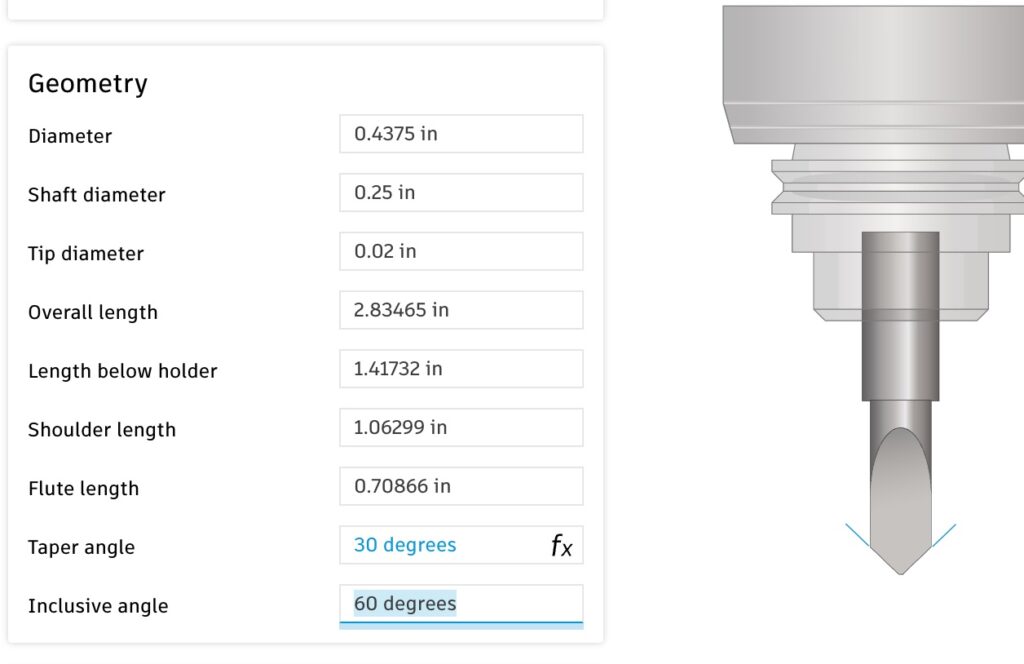 Bits are usually named and sold by the Inclusive Angle, which is the total angle. The Taper Angle is half the inclusive angle, as shown to the right. Fusion will name bits based on the Taper Angle — so if you see it named as a 30 degree bit in Fusion, don’t get confused and put 30 degrees as the Parameter when it is really 60; things won’t work right!