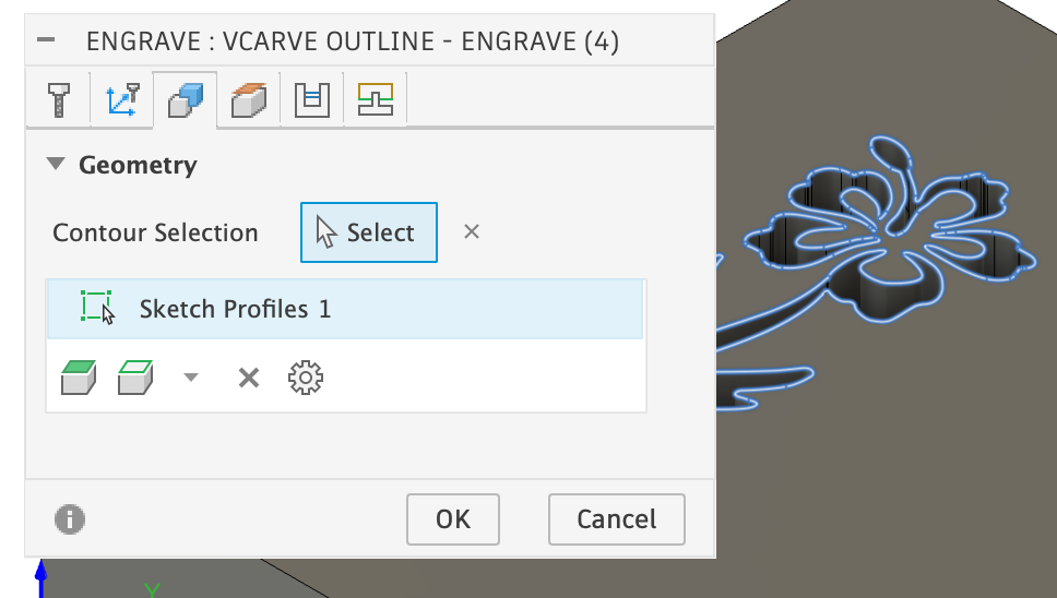 1st Toolpath: VBit Outline: A 2D Engrave toolpath. Engrave will only follow closed profiles.