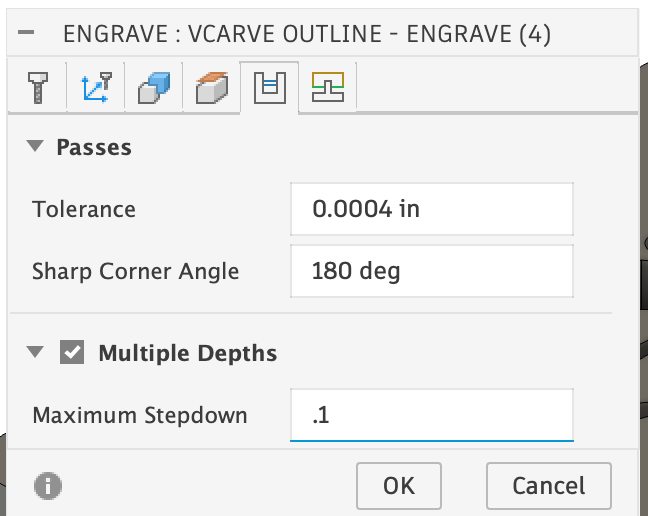 Machining with Multiple Depths / Stepdown: Most toolpaths have “Multiple Depths”, but Pencil does not. To work around this, right click on the Pencil toolpath and select “Duplicate”. Rename the first one “VBit Rough”. Double click on it to edit it. On the Passes tab, check Stock to Leave and set the Axial Stock to Leave to be half your inlay depth. IE: if your depth is 0.200″, set it to 0.100″.
