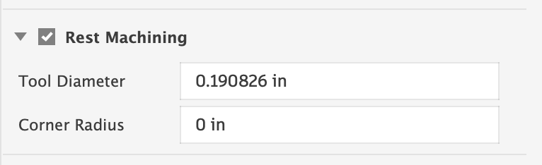 You may want to do additional clearance bit passes with a larger diameter bit. I’d recommend duplicating the Clearance toolpath, and changing the bit to a larger diameter. For the smaller bit toolpath, turn on “Rest Machining” (as mentioned above), and make the parameter value hardcoded to the previous larger bit diameter. For instance, if you use a 1/4″ bit for your main clearance, and a 1/8″ bit for the rest clearance. Set the Rest Machining Tool Diameter to this value (just paste it in, or type it in and hit enter): 0.25″+pocket_stock_to_leave * 2.0 – make sure you have the inches marker in there!