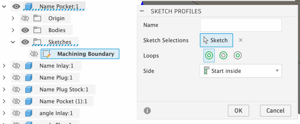 The Sketch Profile is set to a single Sketch: the Machining Boundary sketch that was created in the “Name Pocket” based on the selected design. It is also set with a Side of “Start Inside”, which is important!