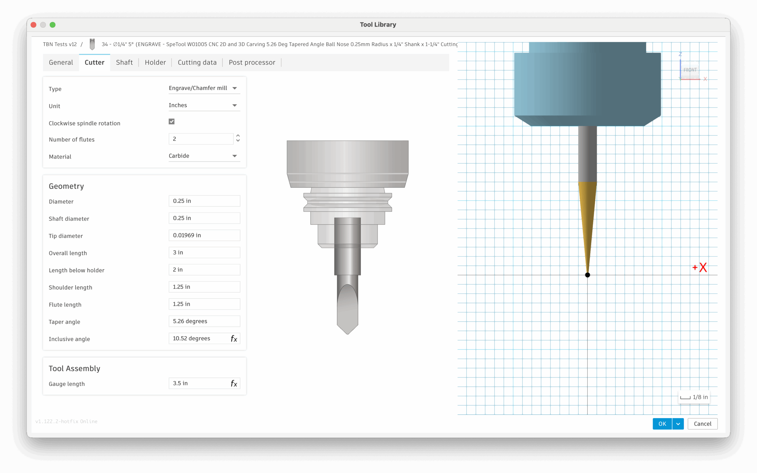 Tapered Ball Nose Mills (TBN bits): These will work fine with 3D toolpaths, but they will not work with the 2D “Engrave” Toolpath for flat inlays. You can copy your TBN tool and set the type to be an “Engrave/Chamfer mill” and set the tip diameter to be the ball diameter. Then it will work as for Engrave / 2D Toolpaths, but note that it will act like it has a flat bottom instead of a ball.